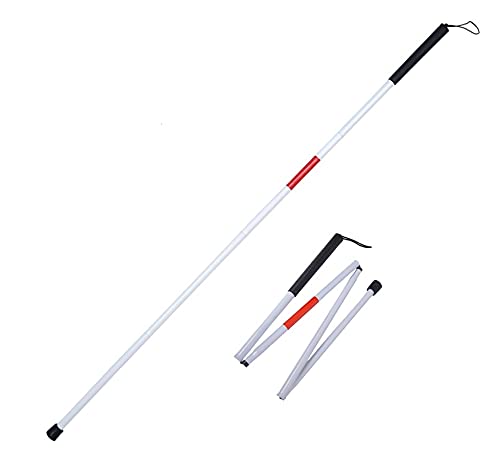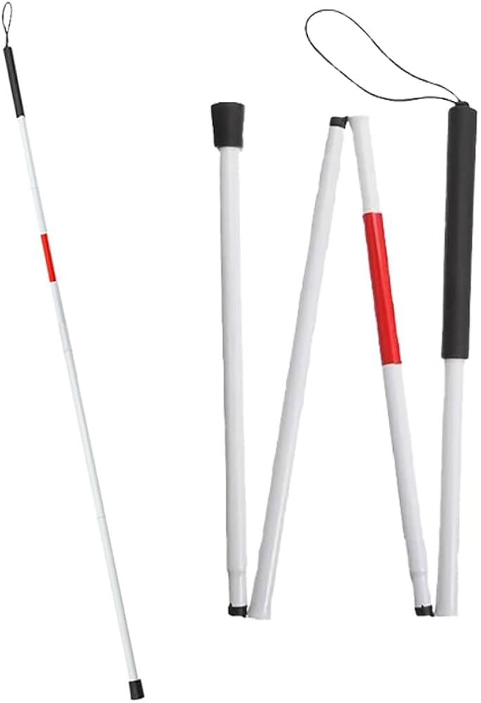 A white cane is a long rod-like device used by blind or visually impaired travelers to give them information about the environment they are traveling through.